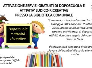 Si comunica che dal lunedì al venerdi dalle ore 15.00 alle ore 20.00 presso la Biblioteca Comunale saranno attivi servizi di doposcuola e attività ludico ricretaive a favore dei minori con i Volontari del Servizio Civile Nazionale.
