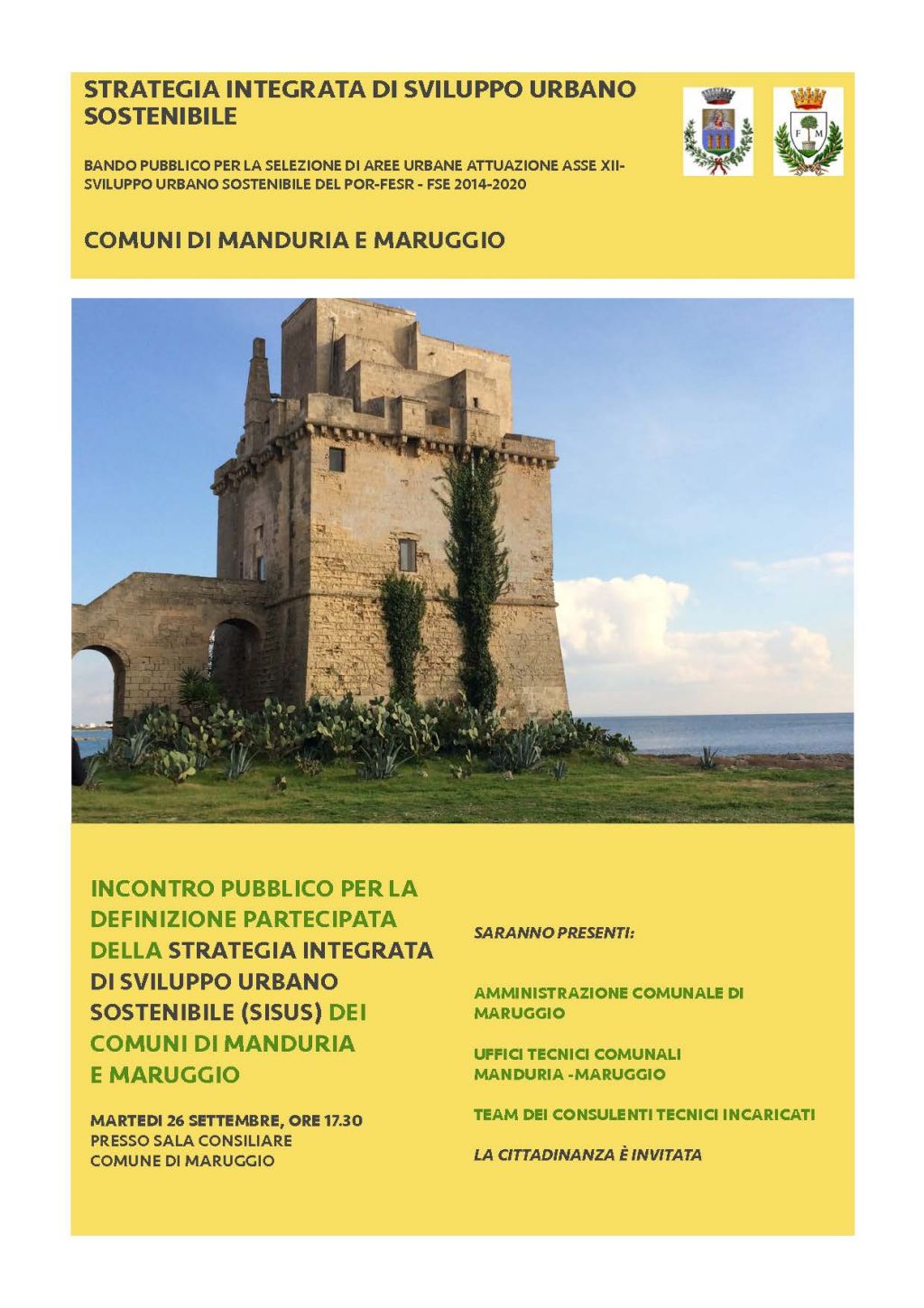 "Incontro pubblico per la definizione partecipata della Strategia Integrata di Sviluppo Urbano Sostenibile (SISUS) dei Comuni di Manduria e Maruggio"