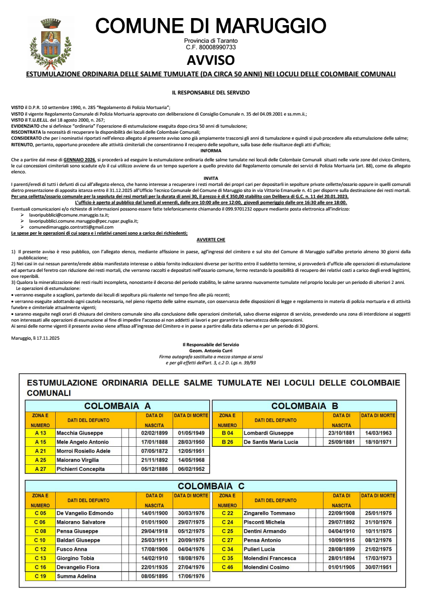 - Il presente avviso è reso pubblico, con l’allegato elenco, mediante affissione in paese, agli ingressi del cimitero e sul sito del Comune di Maruggio sull’albo pretorio per almeno 30 giorni dalla pubblicazione.